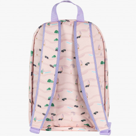 A lightweight, practical and stylish children's backpack, decorated with cars on a winding road, available in green or pink. Ideal for school or outings, with a design inspired by the legendary Le Mans Classic.