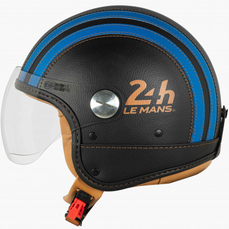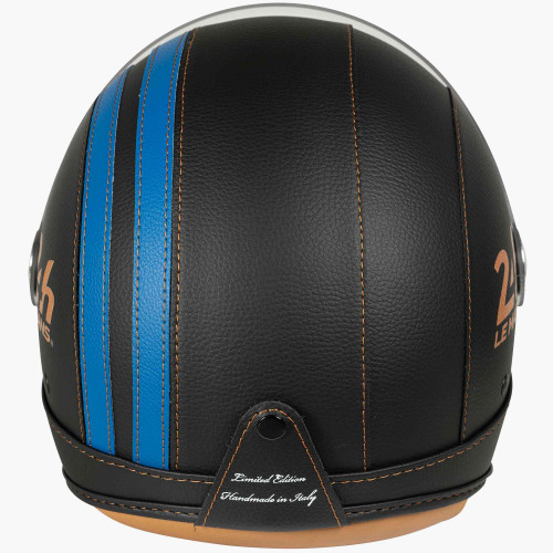The 24H Le Mans Jet Leather Helmet stylishly embodies the legacy of the legendary race. Designed for motorcycle enthusiasts and thrill seekers, it combines premium comfort with iconic design. Its genuine leather outer shell is enhanced by two racing blue stripes running across the top and back a subtle nod to the world of motorsport. The official 24H Le Mans logo is discreetly placed on the left side of the helmet.
