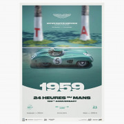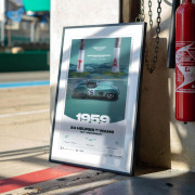This collector's poster from the 24 Hours of Le Mans centenary collection features the Aston Martin DBR1/300, winner of Le Mans in 1959. The Aston Martin DBR1's victory at the 1959 Le Mans 24-hour race marked a significant achievement in the face of Ferrari's dominance. The car, which replaced the Aston Martin DB3S, was developed by a small team led by Ted Cutting, who designed the bodywork, chassis, and engine. The DBR1 initially had a 2.5-liter inline 6 engine, but later featured a 3-liter inline 6, producing 250 bhp in the 1957 specification. With an alloy engine block and rear transaxle, the DBR1 was cutting-edge technology at the time.