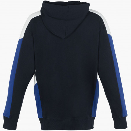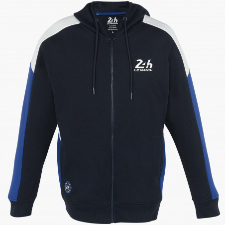 Choose our navy blue hoodie from the 24 Heures du Mans collection. Comfortable and stylish, with its blue and white stripe detailing on the sleeves, it transports you to the heart of the action by embodying the competitive spirit that drives the 24 Hours of Le Mans race.