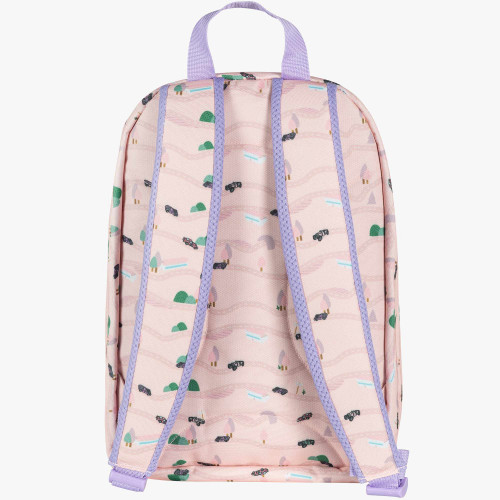 Un sac à dos enfant léger, pratique et plein de style, décoré de voitures sur une route sinueuse, décliné en vert ou rose. Idéal pour l’école ou les sorties, avec un design inspiré du mythique Le Mans Classic.